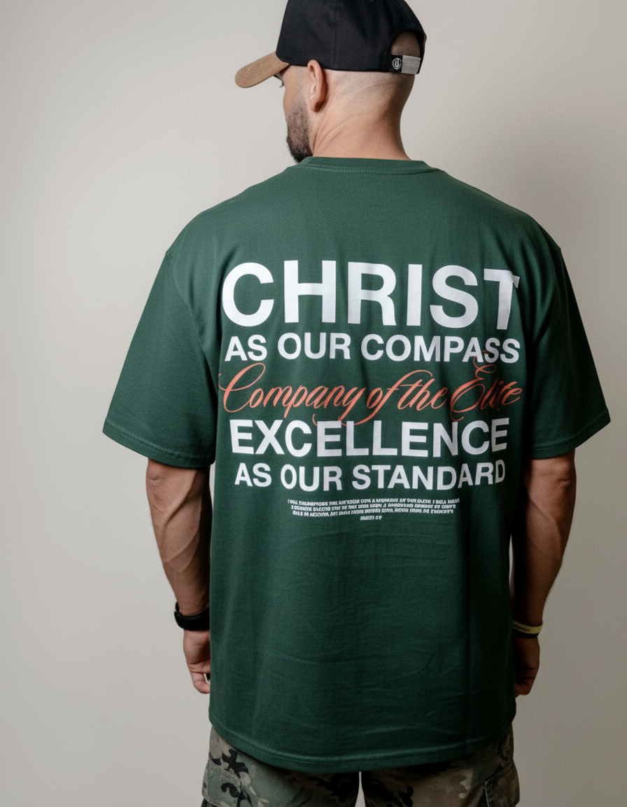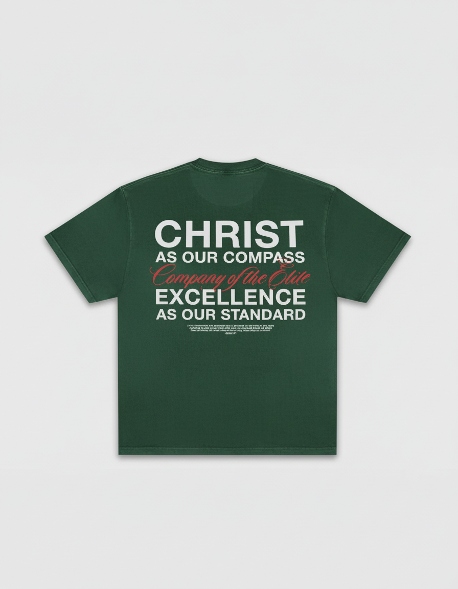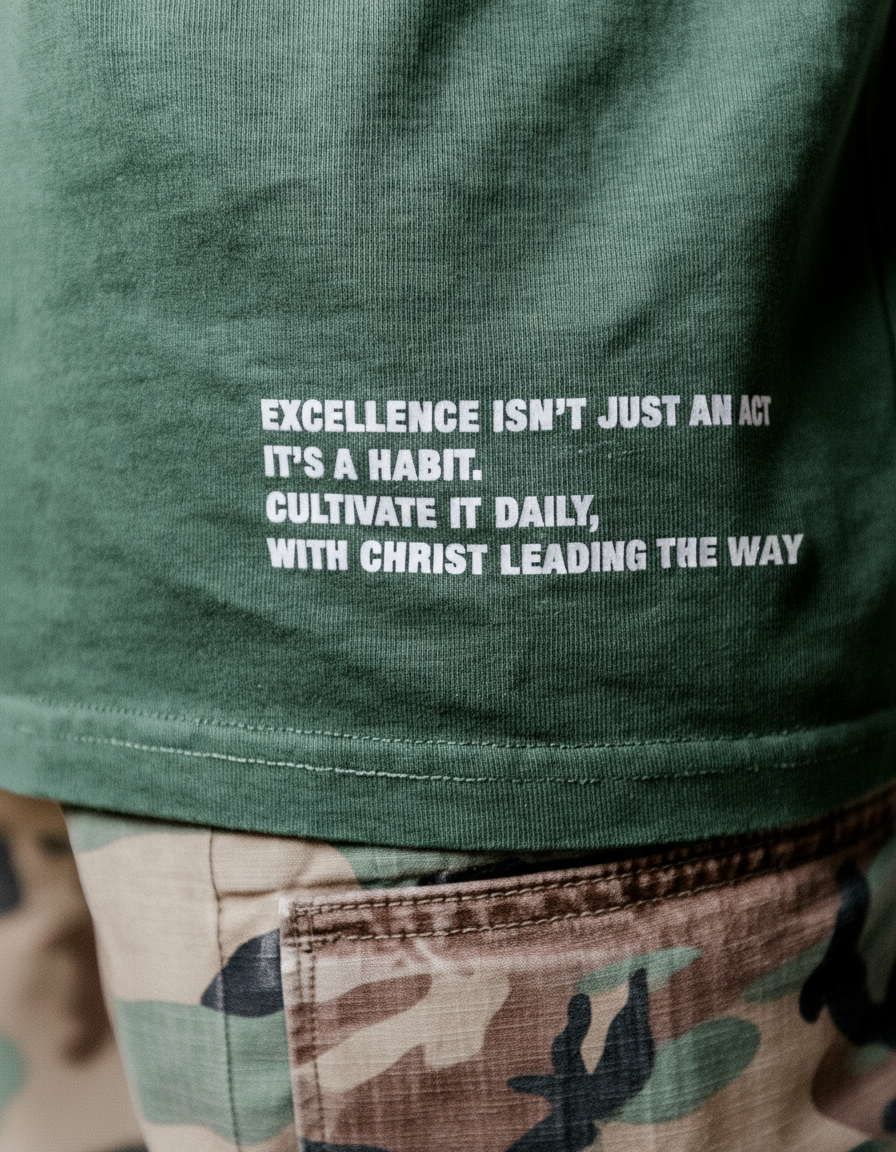 A reminder on the hem saying " Excellence isn't an act, it's a habit. Cultivate it daily with Christ leading the way"